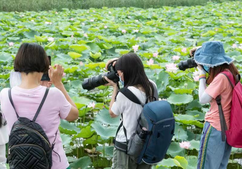 “灼灼荷花瑞,亭亭出水中。一茎孤引绿,双影共分红。”夏至时节的广州螺涌公园,接天莲叶碧绿层叠,映日荷花竞相绽放。尽管连续数日雨水不断,摄影发烧友、花粉们仍然纷纷为荷而来,定格水珠在荷叶上被微风推动的晶莹碧透,捕捉水滴滑过花瓣落入荷塘的动人瞬间。
