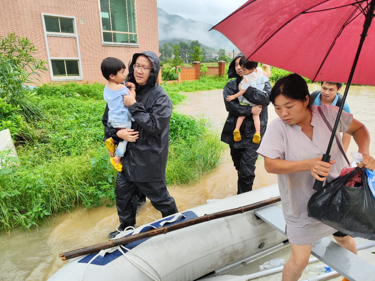 队长龙明勇则冲在最前面,抱着受困群众一个个脱险,拉着救生艇过深水区;队员李益锦,第一时间下水拉船、推船,确保救生艇一次次顺利通行,成功将受灾群众转移到安全地带。