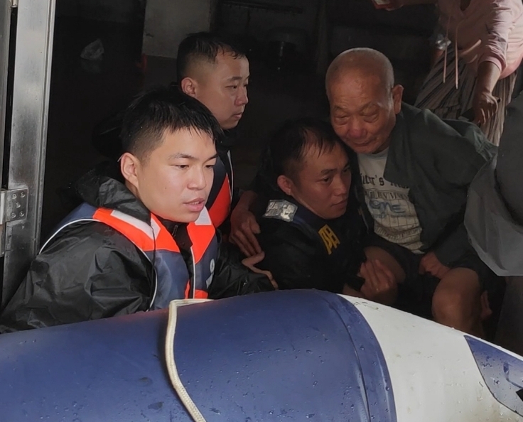 此时只听“扑通两声”,队员薛晨、李益锦两位同志果断跳入深水中。“我们第一次采用肩膀架着梯子铺路的方式,但由于水位较高,距离屋顶太近,没有成功。”薛晨告诉记者,“我们第二次尝试采用接力托举的方式,成功将受困老人安全送上救生艇。”