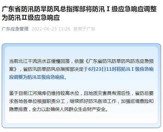 当前北江干流洪水正缓慢回落,依据《广东省防汛防旱防风防冻应急预案》,广东省防汛防旱防风总指挥部决定于6月23日11时将防汛Ⅰ级应急响应调整为防汛Ⅱ级应急响应。