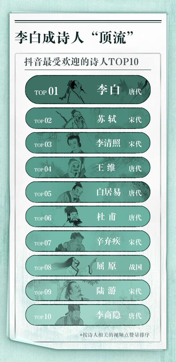 6月20日,抖音发布《抖音古诗词数据报告》(以下简称“报告”)。报告显示,这位“诗仙”是抖音网友最爱的诗人,其相关视频播放量高达35亿次,几乎是位列最受欢迎诗人排行榜第3到第10位的李清照、王维、白居易、杜甫、辛弃疾、屈原、陆游、李商隐播放量的总和。而位列第二、近年的超级网红苏轼的11亿次播放量,也与李白有着“断层式”的差距。