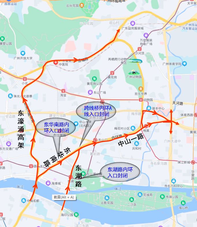 1.往燕岭路、广园路、先烈路方向:绕行东濠涌高架路;
