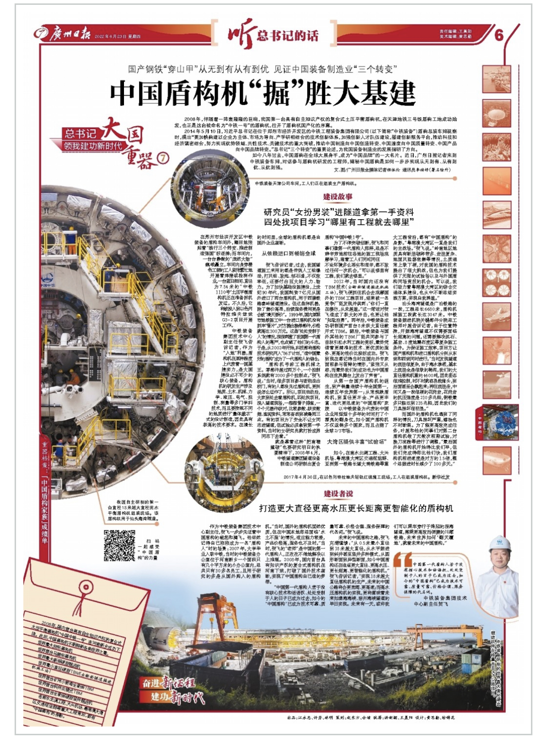 如今,在南水北调工程、大兴机场、粤港澳大湾区交通枢纽群、亚洲第一铁路长隧大瑞铁路等重大工程背后,都有“中国盾构”的身影。“粤港澳大湾区一直是我们的主战场。”贺飞说。“岭南地区地质具有断层破碎带多、岩层复杂、地面风险源密集等情况,土质通常上软下硬,对我国的盾构技术提出了很大挑战,但也为我们提供了无限的试验场以及与外国盾构同场竞技的机会。可以说,我们助力着粤港澳大湾区的综合交通体系建设,也从中不断总结实践方案,实现自我跨越。”