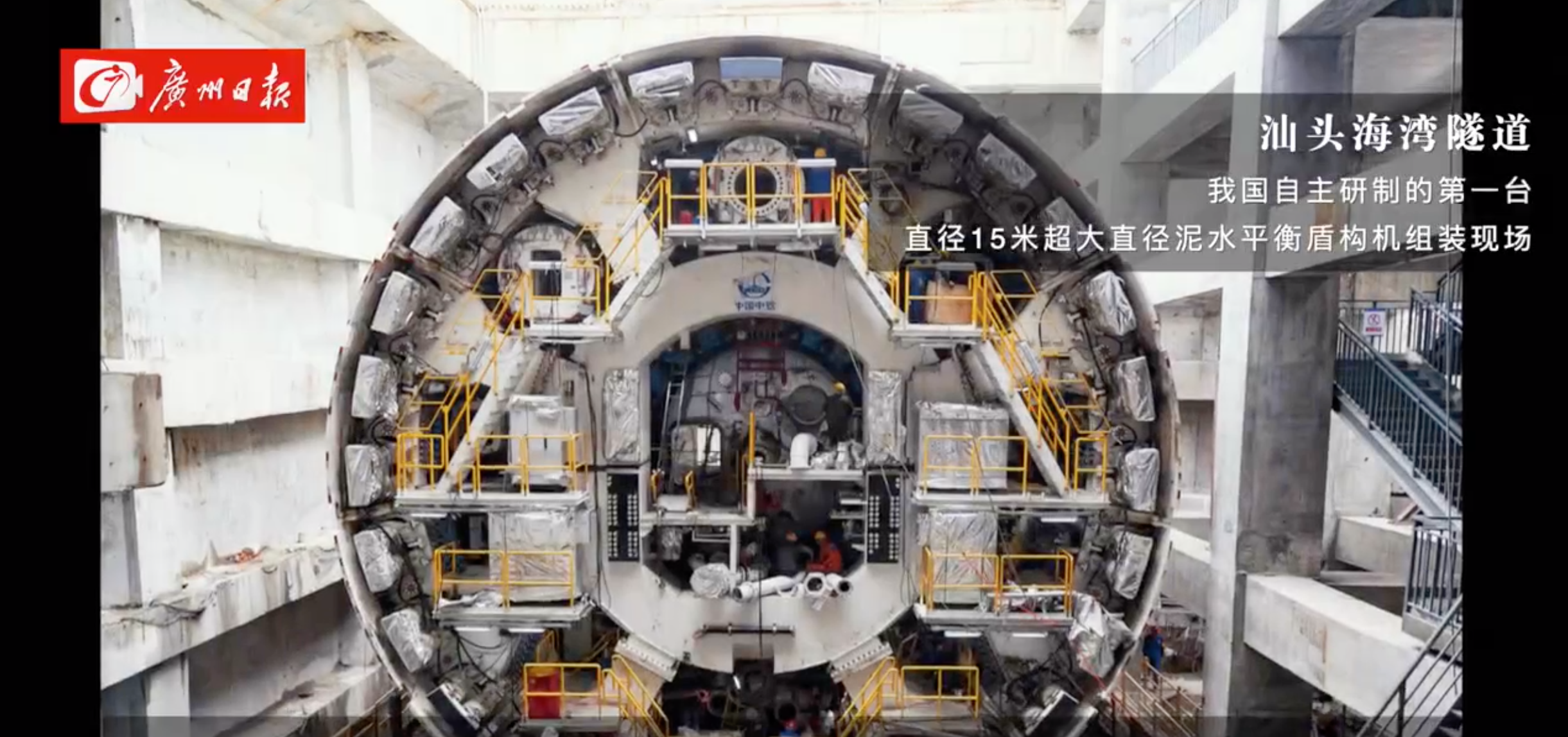 我国自主研制的第一台直径15米超大直径泥水平衡盾构机组装现场。该盾构机用于汕头海湾隧道。