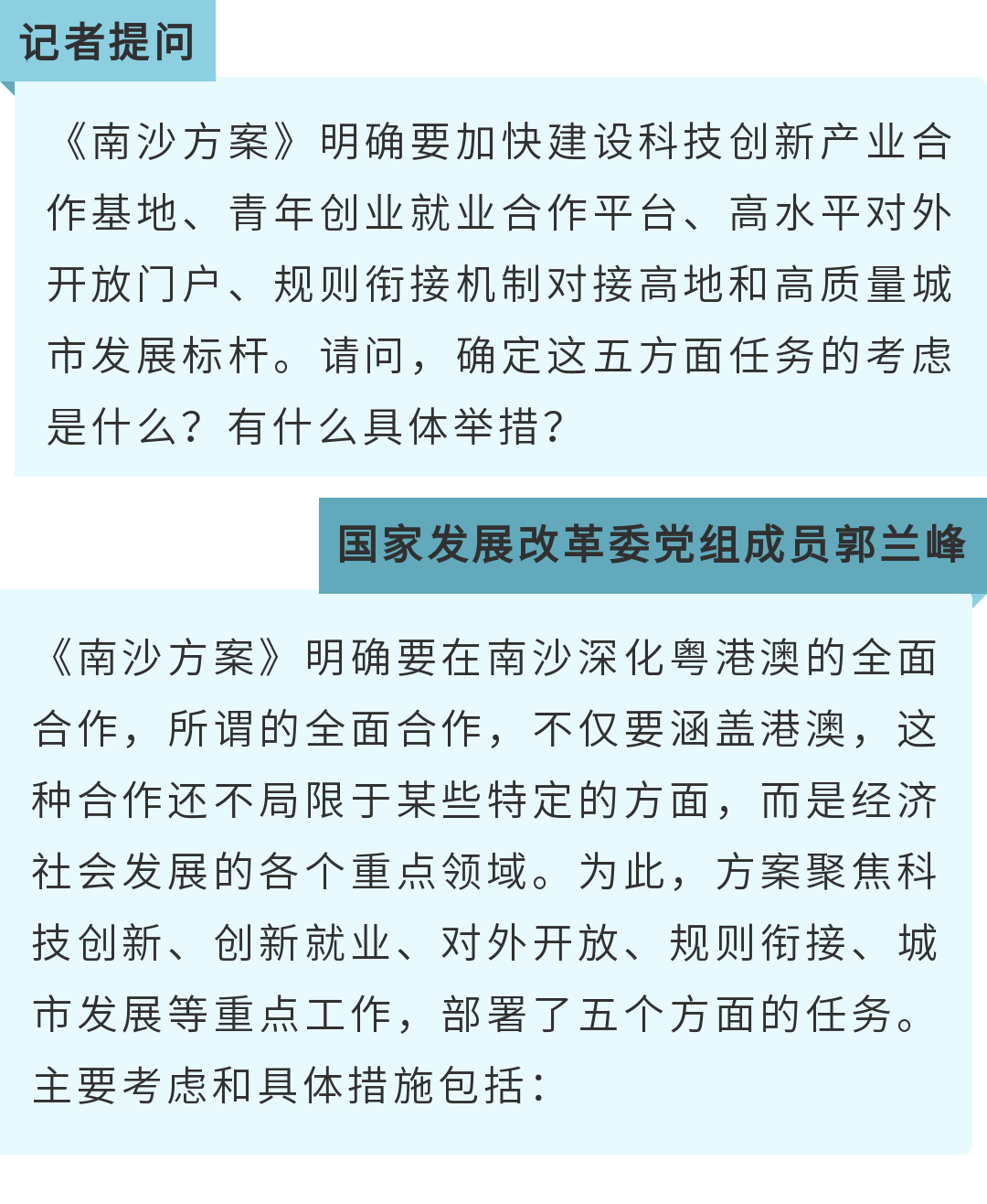 《南沙方案》提出这五方面的任务,指明了南沙粤港澳重大合作平台建设的主攻方向。下一步,我们将按照党中央、国务院决策部署,与有关部门和广东省、广州市一道,不断深化认识,准确把握,推动各项任务落实到位,见到实效。