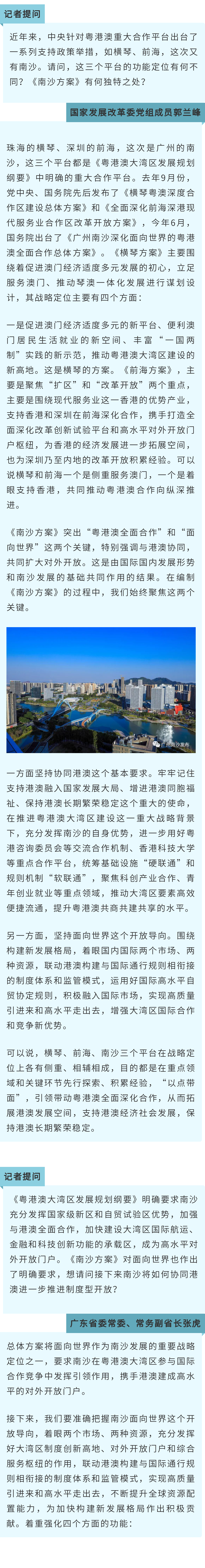 这几年,我们按照党中央、国务院的决策部署和粤港澳大湾区建设领导小组的工作安排,会同粤港澳三地和有关部门,研究编制了《广州南沙深化面向世界的粤港澳全面合作总体方案》,简称《南沙方案》,报请国务院印发实施。前几天,《南沙方案》公开发布。