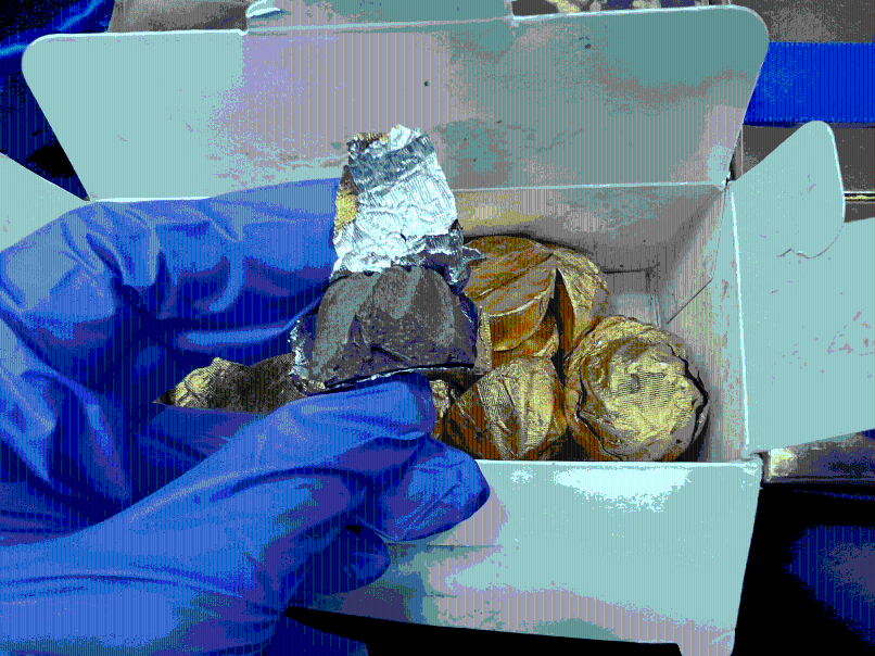 今年4月,广州海关在邮递渠道查获俗称为“0号胶囊”的新型毒品二甲基色胺,共计1.39千克。该批毒品伪装成巧克力,外包装、形态与普通盒装巧克力无异,CT机、X光机成像与普通物品基本一致,包装盒上还清晰标注了生产日期、品牌等相关信息。但经海关关员仔细比对后发现,同样包装的巧克力每盒看似规格相同但实际重量却并不一样,且单颗巧克力用铝箔纸包装的手法较为粗糙,存在伪装痕迹。后经取样送实验室检测,确认邮件中8盒巧克力均掺杂有新型毒品二甲基色胺成分,总重1.39千克。