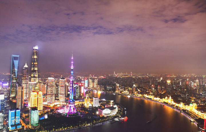 从上海白玉兰广场顶楼俯瞰浦东陆家嘴夜色(2020年10月18日摄,多重曝光图)。新华社记者 方喆 摄