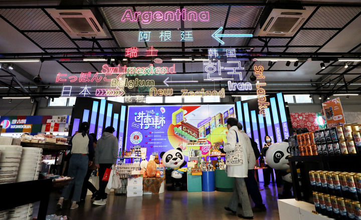 在上海市南京路上的进博集市内,顾客们走在一处各国商品集中展示台前(2021年11月8日摄)。新华社记者 方喆 摄