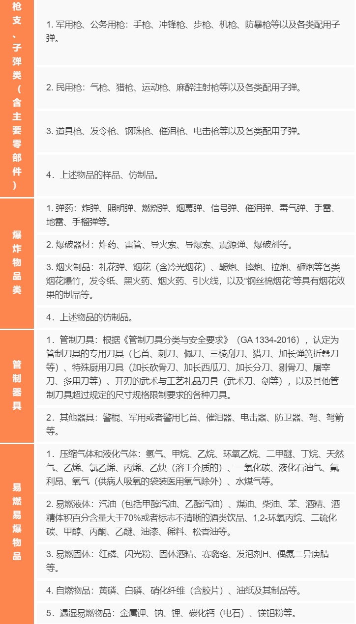 包括菜刀、水果刀、剪刀、美工刀、雕刻刀等日用刀具(刀刃长度超过60毫米);(刀具也明确规定了长度哦,普通的日用刀具刀刃长度小于60毫米可携带)