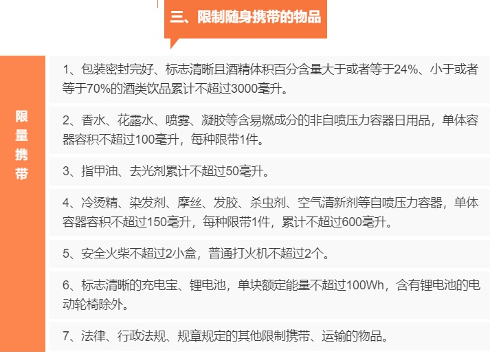 2 ►香水、花露水、喷雾、凝胶等含易燃成分的非自喷压力容器日用品,单体容器容积不超过100毫升,每种限带1件。(普通凝胶类免洗洗手液不超过100毫升可以携带啦)