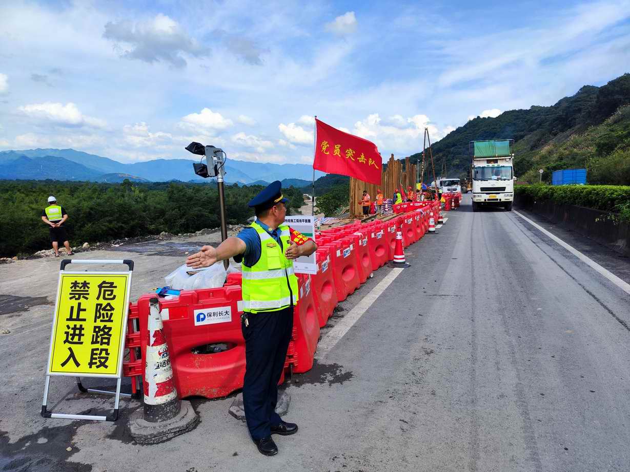 为更好地观察水毁情况,四中队使用无人机对现场情况进行“高空”监测,并派人在现场全程值守,疏导过往车辆,确保抢险车辆顺利通过。按照所掌握的各项信息,路政大队连夜就召开抢险方案讨论会,决定在龙怀高速及韶新高速连接处、英华互通路段实施分流,同时封闭大镇站、翁城站北行入口。