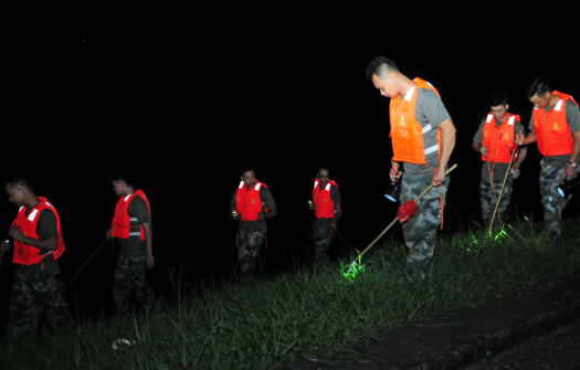 当晚11点多,5.45公里长的花都区防守责任段堤坝上,10个镇街相隔五六百米设立一个值守点。夜幕下,巡堤人员手持电筒、竹竿,排成一列,对坝体迎水坡和背水坡区域来回巡视查险,确保不遗留一处死角,发现问题,迅速上报指挥部,及时落实处置和消除安全隐患。巡堤回来,满身是汗的队员们才有空喝口水,坐下来稍事休整,随后再接着继续战斗。
