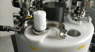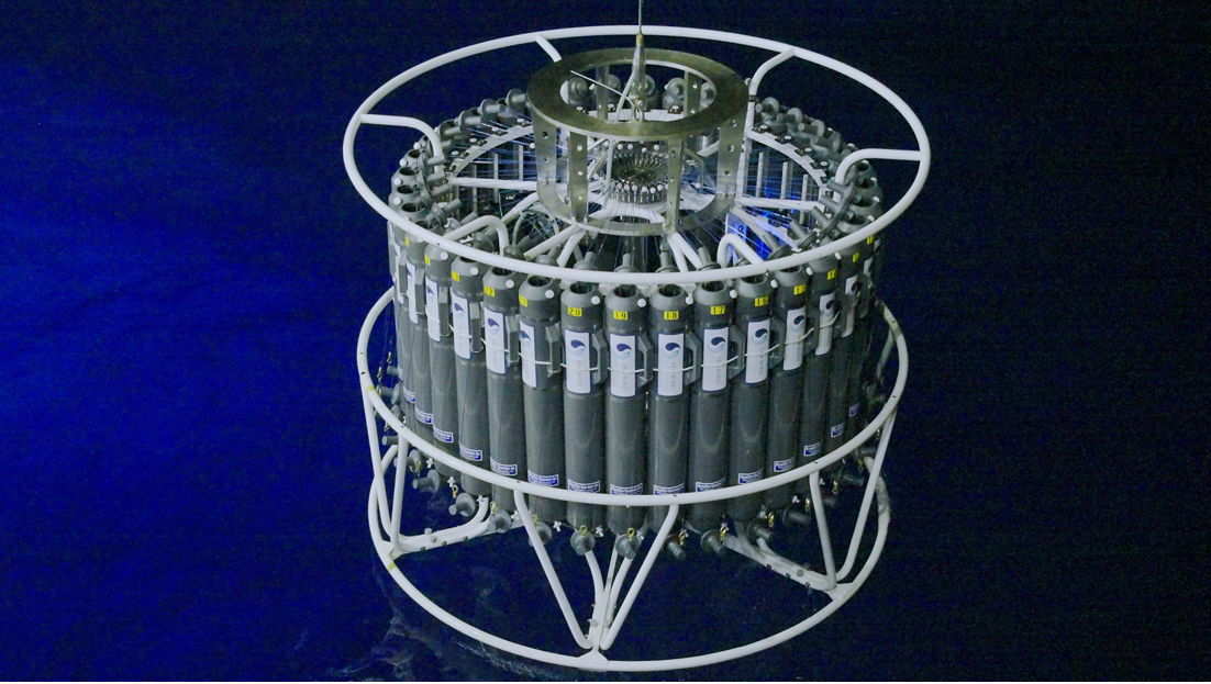 CTD设备看上去如同36个水瓶绑在一起的综合体,谢鹏说,该设备确实如同水瓶的集合,但是多了很多自动化的功能。每个水瓶可以采集12升的海水,并且在不同水深处根据设置取出相应的海水。