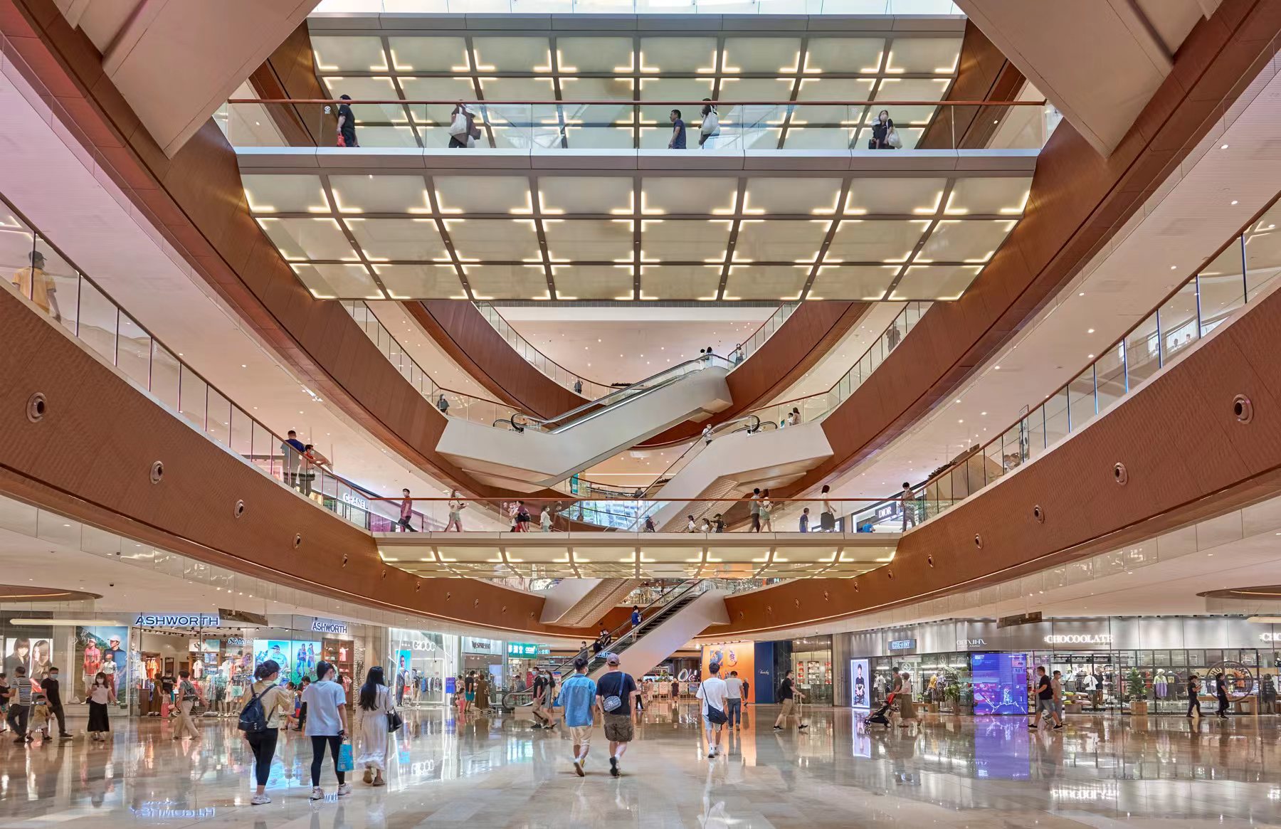 新鸿基地产在华南首个全新设计开发的大型购物中心天环广场,打破“围墙”的设计定式,地面保留大面积户外空间,以开放式花园为设计理念,首次将“公园”设计融入现代购物商场中。