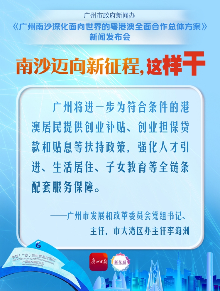 对于《南沙方案》提出的实施面向港澳人才的特殊支持措施,广州将进一步为符合条件的港澳居民提供创业补贴、创业担保贷款和贴息等扶持政策,强化人才引进、生活居住、子女教育等全链条配套服务保障,为港澳居民到南沙创业就业创造更大的舞台。
