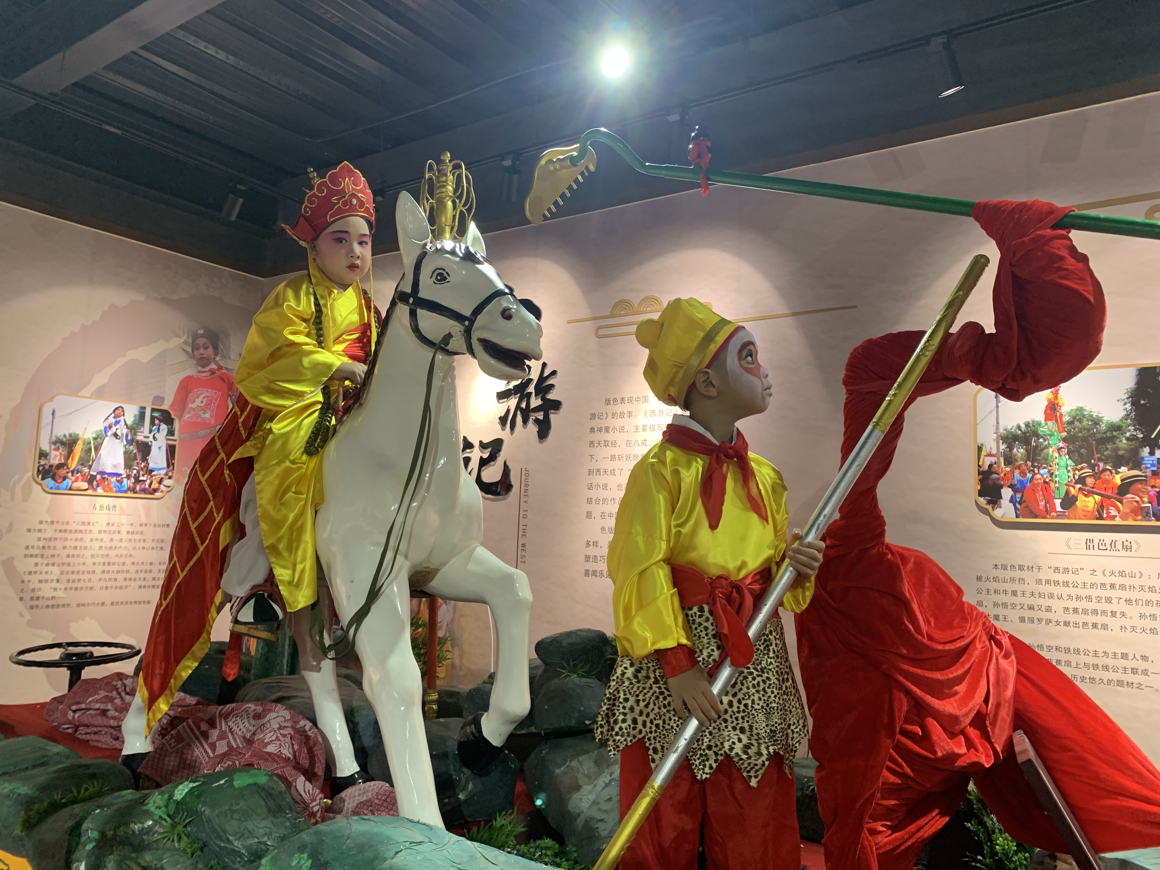 在展馆中,最为吸引人的要数员岗飘色展示。几位萌娃扮成孙悟空、雷震子、唐三藏、韩湘子人物形象,再现《丁山射雁》《西游记》等传统经典飘色。虽没有飘色巡游时的喧嚣热闹,但是看到记忆中的飘色展示重现眼前,村民们表现得有点小兴奋,纷纷拿出手机拍照留念。