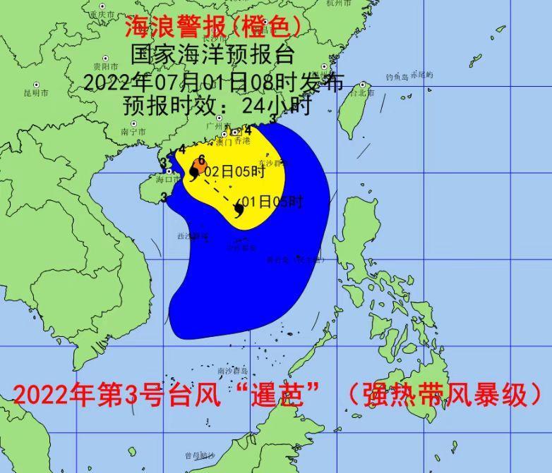 海浪方面,预计7月1日中午至2日中午,南海北部将出现4到6.5米的巨浪到狂浪区,近海海域海浪预警级别为黄色;广东近岸海域将出现3到5米的大浪到巨浪,该近岸海域海浪预警级别为橙色;海南东部近岸海域将出现2.5到3.8米的大浪,该近岸海域海浪预警级别为黄色。