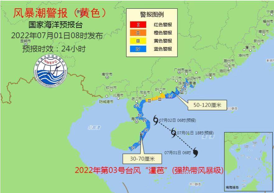 风暴潮方面,受今年第3号台风“暹芭”(强热带风暴级)的影响,预计7月1日上午到2日中午,珠江口到雷州半岛东岸沿海将出现50到120厘米的风暴增水,海南岛东北部沿海将出现30到70厘米的风暴增水。上述岸段内的广东北津和水东潮位站将于2日中午出现达到当地黄色警戒潮位的高潮位,海南秀英潮位站将于1日夜间出现达到当地蓝色警戒潮位的高潮位,广东三灶潮位站将于2日上午出现达到当地蓝色警戒潮位的高潮位。广东省阳江市和茂名市的风暴潮预警级别为黄色,海南省海口市和广东省珠海市的风暴潮预警级别为蓝色。