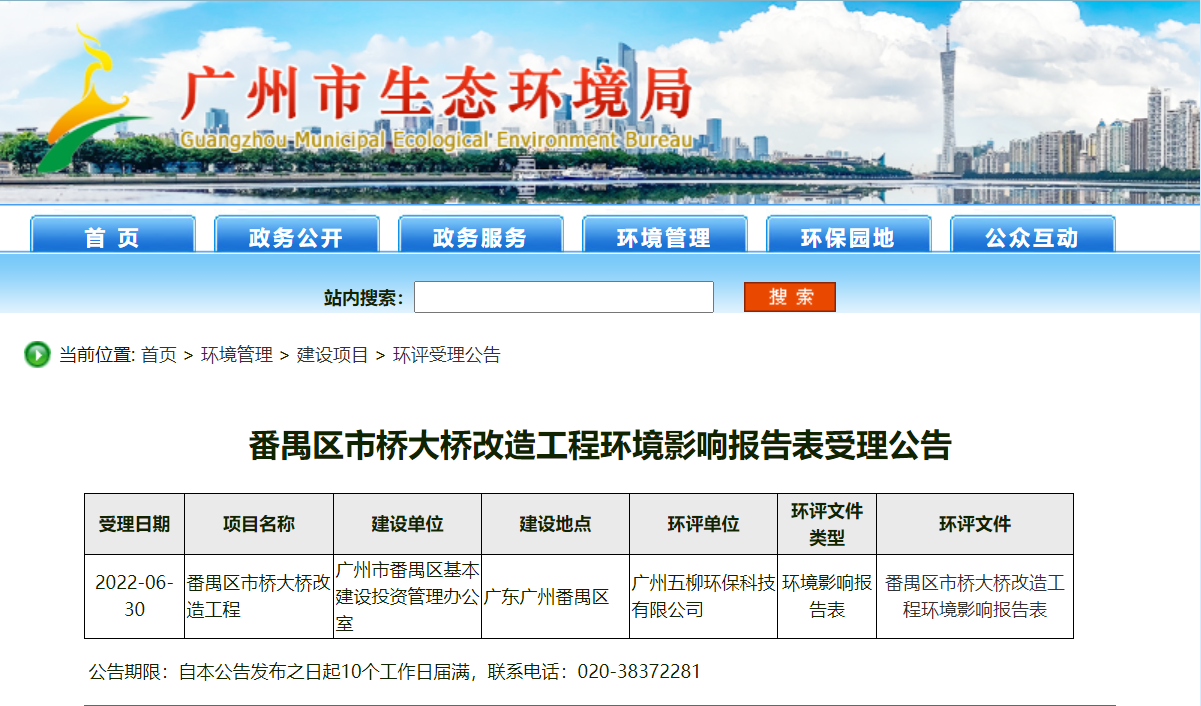 近日,广州生态环境局官网公布了番禺区市桥大桥改造工程环境影响报告表受理公告。据该工程环境影响报告表显示,为有效缓解现状交通压力,加强区域内道路与外围道路网络体系之间的衔接,改善项目沿线居民的出行条件,该项目工程拟将现状市桥大桥拆除重建并拓宽桥梁路面。番禺区市桥大桥改造工程建设单位为广州市番禺区基本建设投资管理办公室 ,该工程施工日期为2022年8月-2024年 4月,总投资11260.76万元。