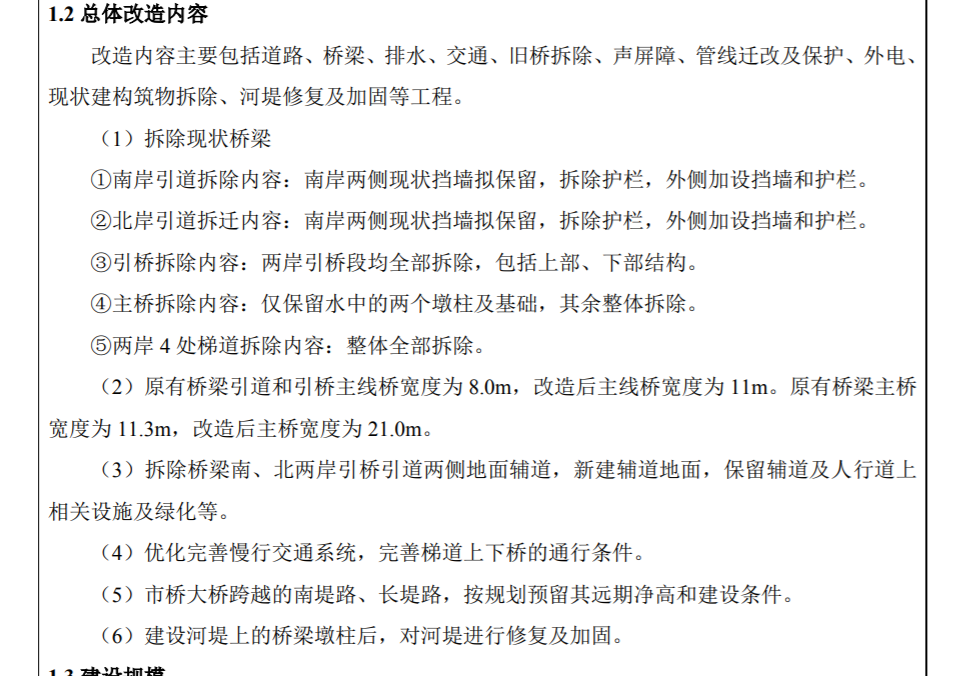 (2)原有桥梁引道和引桥主线桥宽度为8.0m,改造后主线桥宽度为11m。原有桥梁主桥宽度为11.3m,改造后主桥宽度为21.0m。