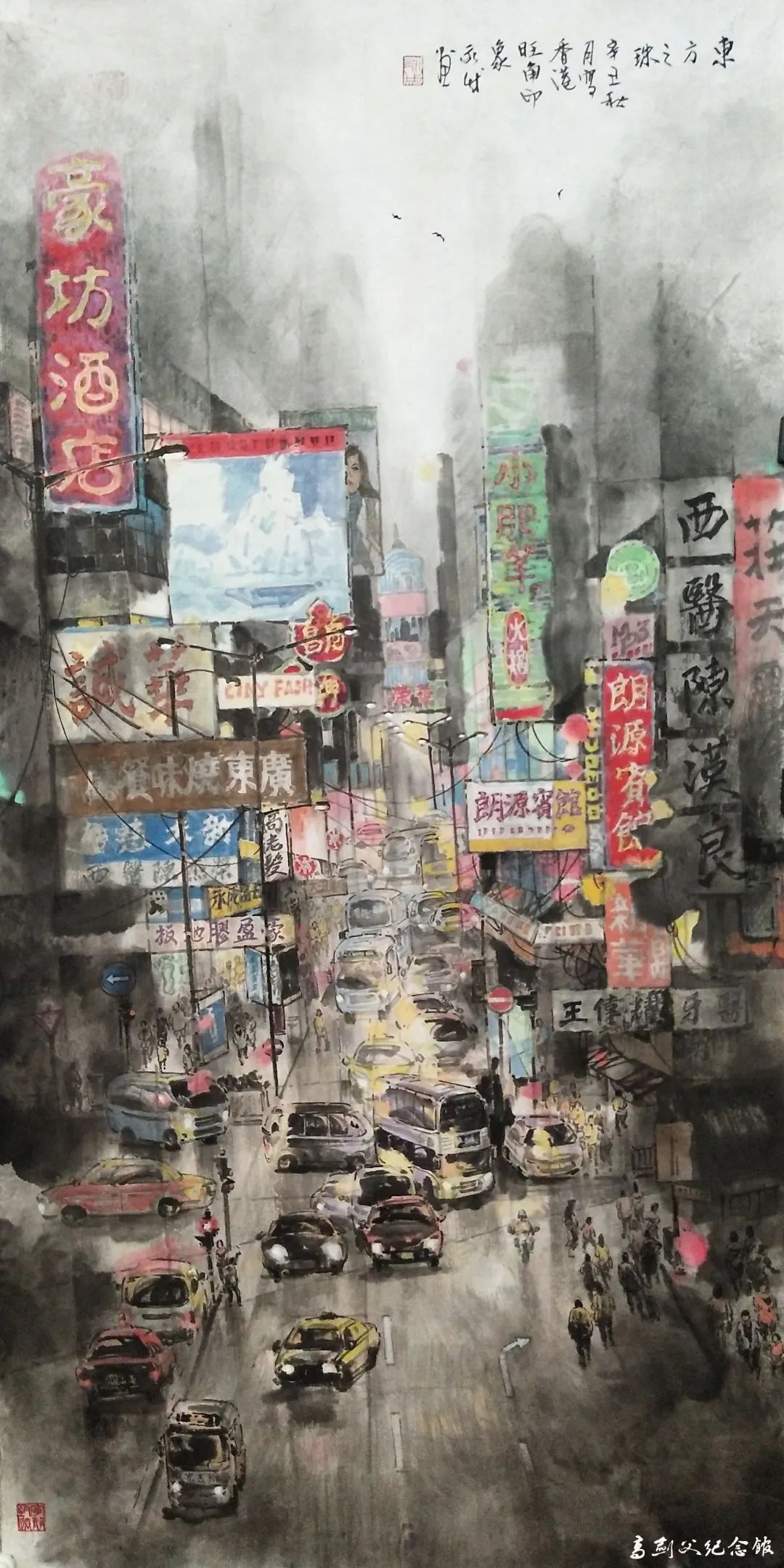 在创作上,因为香港的现代商业文化气息浓郁,我着重在画面中呈现街道上闪亮的招牌、穿行的汽车等动感元素,所选取和表现的人物活动也是鲜活多样的,为的就是让观众感受到香港城市中涌动着的生命力。
