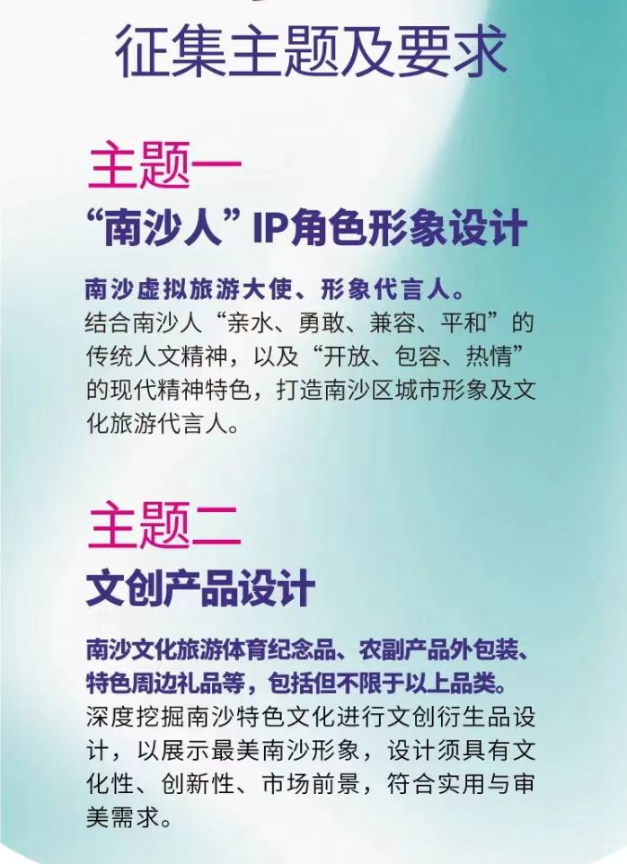 大赛征集主题一为“南沙人”IP角色形象设计,定位为南沙虚拟旅游大使、形象代言人;主题二为文创产品设计,包括南沙文化旅游体育纪念品、农副产品外包装、特色周边礼品等。