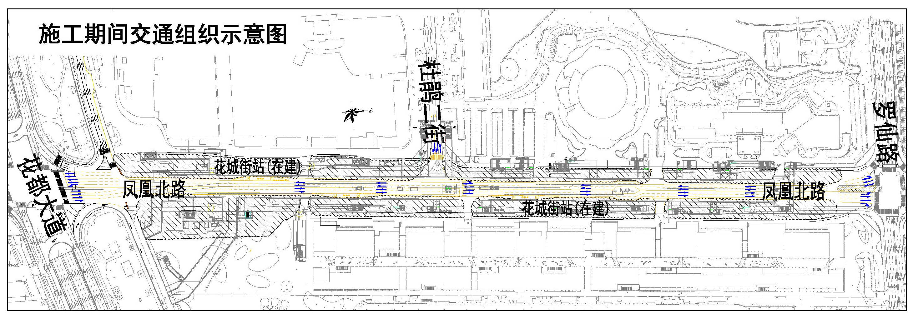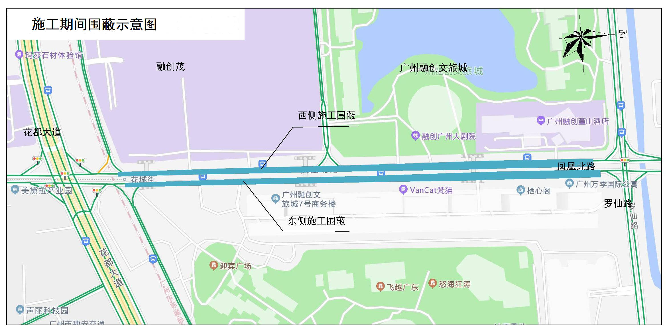 花城街站施工期间,将对凤凰北路(花都大道至罗仙路段)既有双向6车道、两侧隔离绿化带及部分人行道进行围蔽,长度约870米。同时,该路段改为双向4车道通行。该路段位于融创文旅城旁,前往游玩的市民要留意。