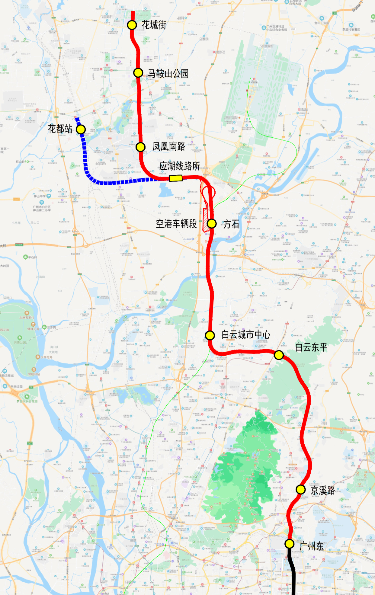 广花城际是广州都市圈南北向的重要客流走廊,也是粤港澳大湾区城际轨道交通网的重要组成部分,线路起自广州东站,经天河区、白云区、花都区至新白广城际的花城街站,全长约39.6公里,设站7座,均为换乘站,线路所1座,配套车辆段1座。