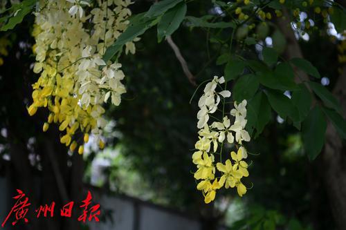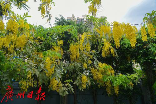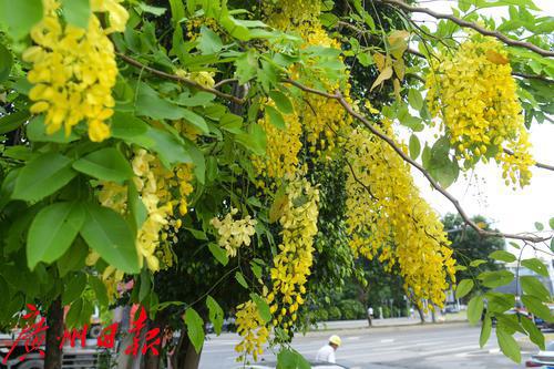 黄埔区护林路西往东方向绿化带上的腊肠树开花了,金黄色的花串满挂枝头随风摇曳,放眼望去,尽是金黄,俨然下了一场“黄金雨”。腊肠树花期一般为6月至8月,初夏满树金黄色花,花序随风摇曳、花瓣随风而如雨落,所以又名“黄金雨”。