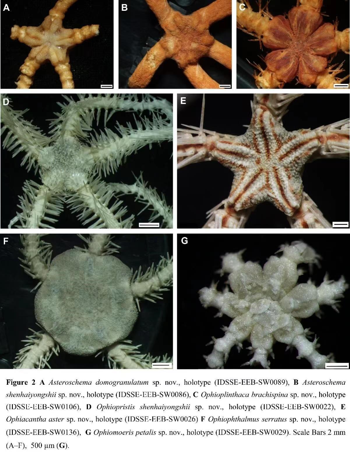 研究人员对2016-2021年通过深海勇士号载人深潜器,在南海、西北太平洋等海域采集的深海蛇尾样品,进行了形态学和分子系统学研究,鉴定出4个目、7个科、15个属的共36种深海蛇尾。其中包括7个新物种,研究人员分别对其进行了描述和命名(两个新物种以深海勇士号命名),有15个物种在南海或西北太平洋海域属于首次被发现(新记录种),为进一步理解南海和西北太平洋的深海蛇尾生物多样性提供了重要数据。此外,研究人员还对棘蛇尾和蔓蛇尾等几个主要蛇尾类群的分类学形态特征进行了比较分析,为这些类群中深海蛇尾的分类和形态鉴定工作提供了科学依据。