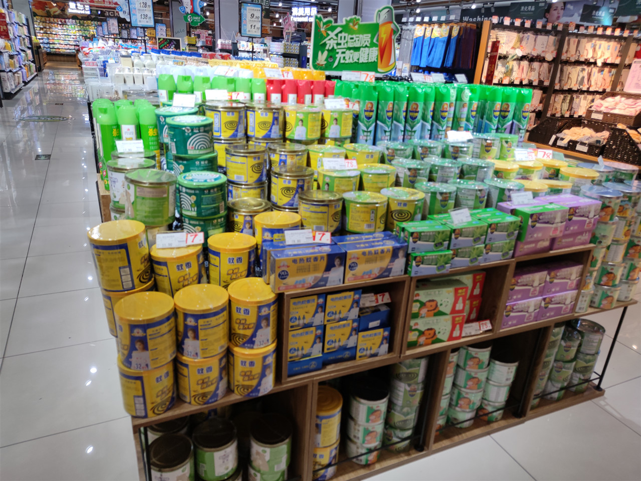 记者走访各大超市和店铺发现,不少商家都将驱蚊产品摆在了走廊过道的显眼位置进行促销。在某大型连锁超市里,记者看到如电蚊拍、灭蚊灯、花露水、蚊香、杀虫喷雾、电热蚊香液、电热蚊香片等占据了中心位置。销售人员介绍,今年五月以来,驱蚊产品都很热销。