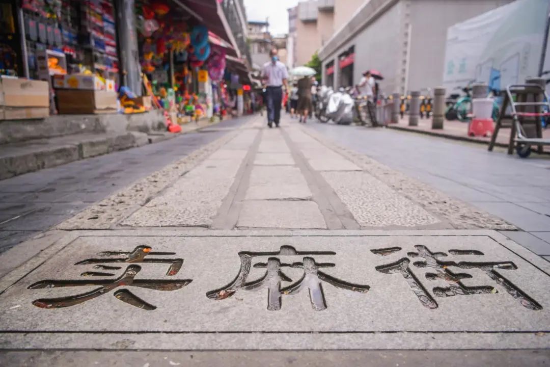 从一德路地铁站B出口走出来,眼前是一条热闹的街巷。虽然路面不宽,但却长数百米,道路两旁是各式各样的商铺,有卖早餐的,有卖海味干货的,还有卖蔬菜水果的,极具生活的烟火气息。在街巷入口处,路面石板上刻着的“卖麻街”三个大字赫然映入眼帘。