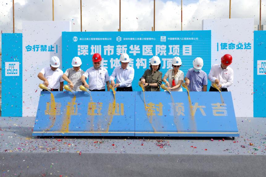 7月7日,深圳市新华医院项目主体结构举行封顶仪式。运营单位北京大学深圳医院(简称:北大深圳医院)、深圳市医疗卫生专业服务中心、深圳市建筑工务署以及项目建设单位等相关领导和建设者代表参加了封顶仪式。