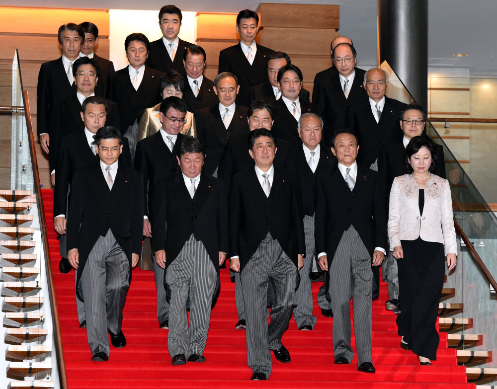 2017年11月1日,在日本东京首相官邸,日本首相安倍晋三(前排中)带领阁僚合影。(新华社摄)