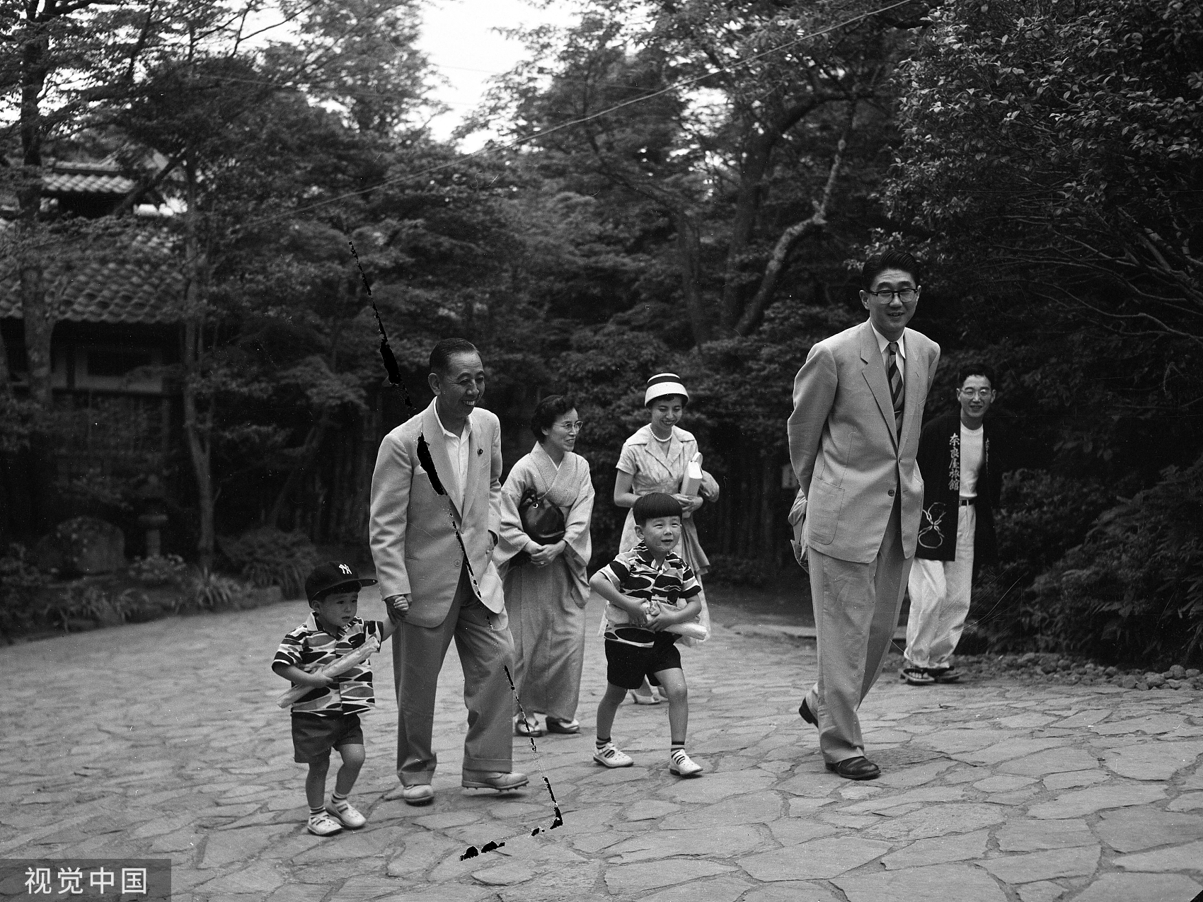 1950年代末,日本箱根,日本首相岸信介与外孙安倍宽信、安倍晋三、女婿安倍晋太郎、女儿安倍洋子在一起。(图源:视觉中国)