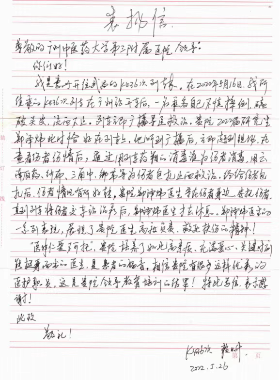 广州日报·新花城记者从广州中医药大学了解到,近日该校第三临床医学院(第三附属医院)收到了一封特别的表扬信,信中表扬的对象是2022级硕士研究生郑泽炜同学。原来,在5月16日惠州开往武昌的K436次列车上出现突发伤员,郑泽炜同学挺身而出给予救治。