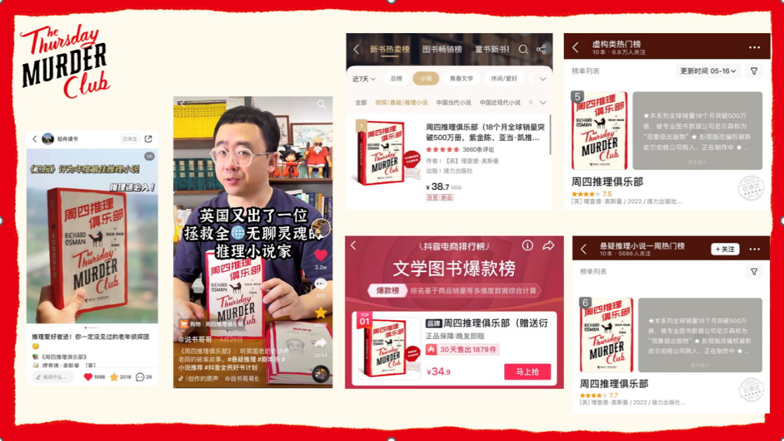 在新书上市的2个月里,《周四推理俱乐部》简体中文版拿到当当小说新书榜第一、抖音文学图书热卖榜第一;登豆瓣新书速递榜,并拿下豆瓣虚构类热门榜第五、豆瓣推理悬疑榜单第六;抖音推荐短视频播放量突破260万,小红书上“爆款”频出。