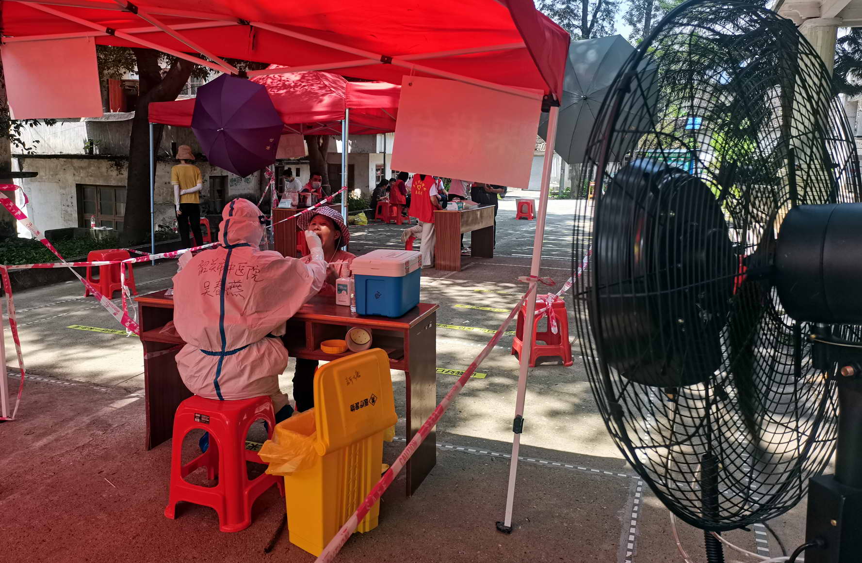 负责核酸采样的医务人员表示:“身穿防护衣,在这种高温天下异常闷热,雾化降温风扇让空气流通,气温更低,感觉更舒适。”
