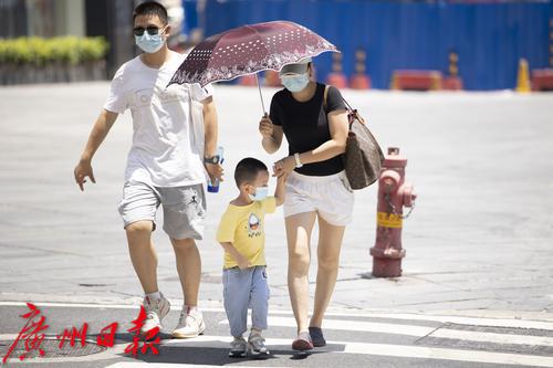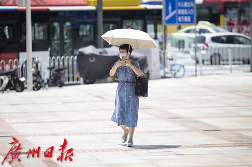 2022年7月11日,天河区、海珠区。11日白天,广州持续高温天气,艳阳高照,三十多度的气温让出行的市民感到炎热难受。遮阳伞、防晒衣、帽子成为市民出行必备防晒装备。
