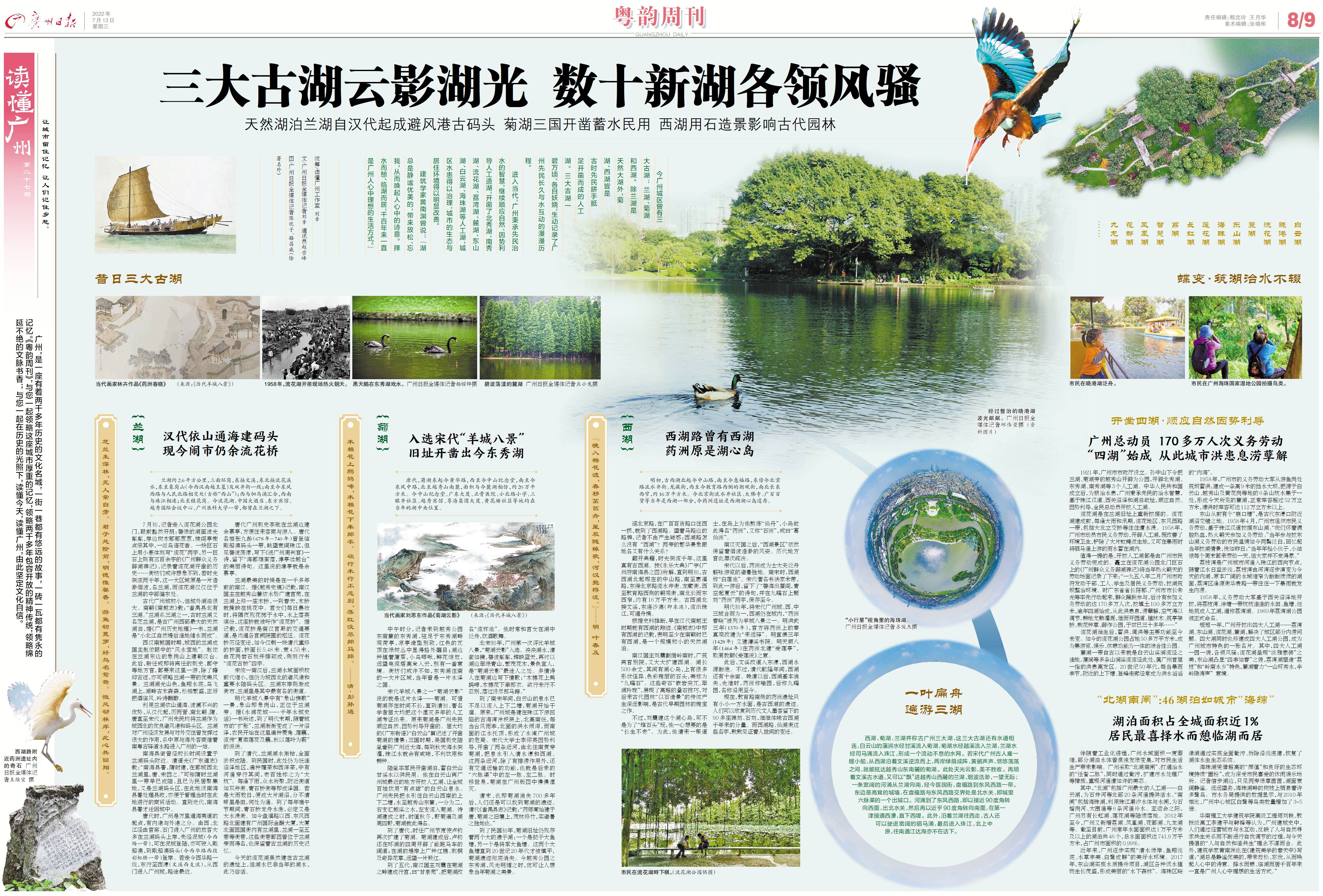 今广州城区曾有三大古湖:兰湖、菊湖和西湖。除兰湖是天然大湖外,菊湖、西湖皆是古时先民胼手胝足开凿而成的人工湖。三大古湖一碧万顷、各自妖娆,生动记录了广州先民长久与水互动的漫漫历程。