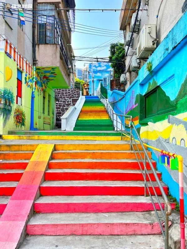 彩虹长廊长约50米,被粉刷成红、黄、绿、蓝、粉、紫等饱和度超高的色彩,看起来格外赏心悦目。