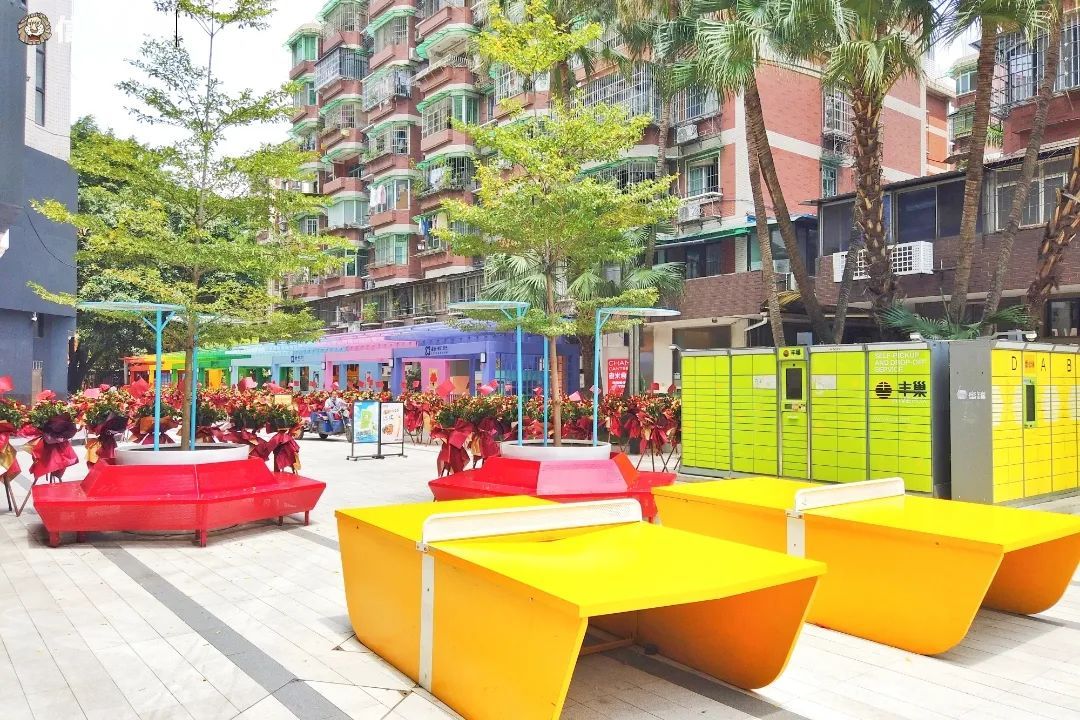 六运小区里的彩色休闲空间,采用大面积的撞色,十分亮眼。