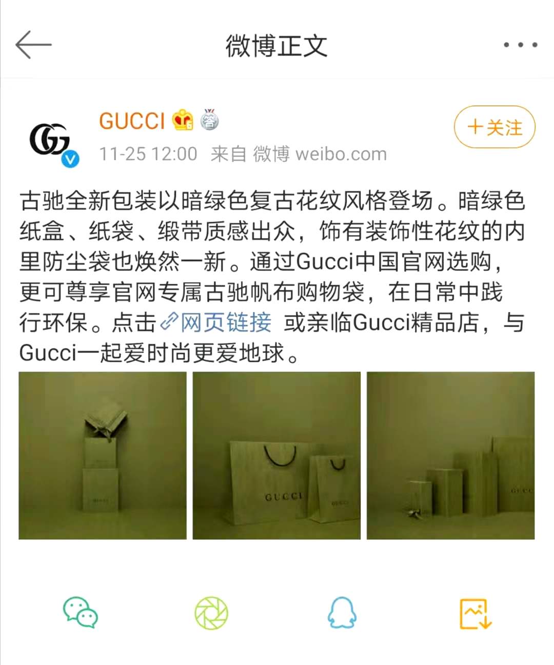全媒体记者获悉,意大利奢侈品牌Gucci近日正式启用全新包装设计,暗绿色装饰性花纹浮印于纸袋与纸盒上,配以同色缎带,Gucci品牌标识则以黑色醒目呈现。为呼应Gucci所推崇的可持续愿景,全新包装在设计和采购原料过程中均秉持保护地球环境的理念,全部可回收利用,消费者通过Gucci中国官网选购还可获赠专属Gucci帆布购物袋。