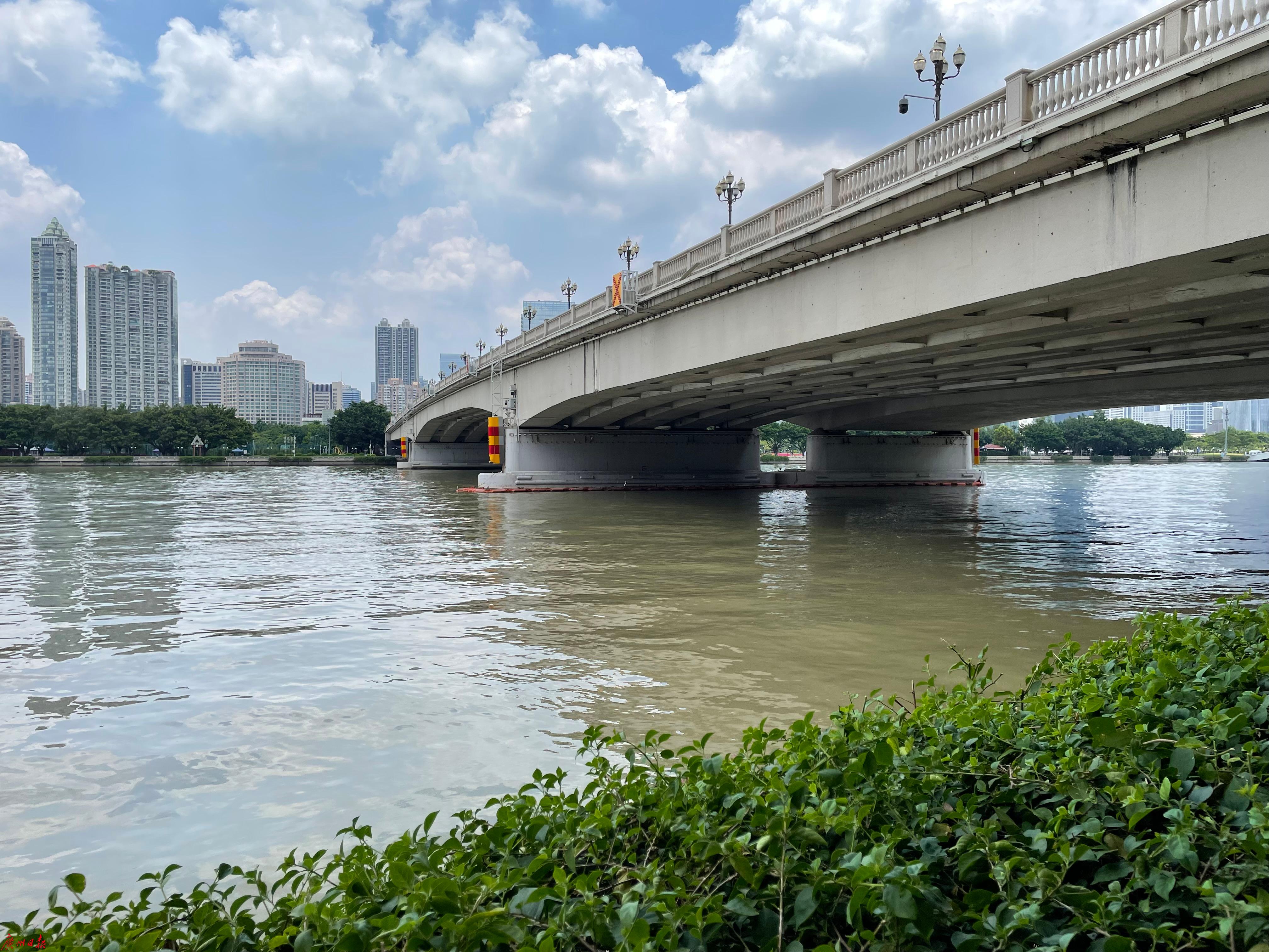 今天12时40分左右,记者来到广州大桥附近的珠江河段,发现江水潮位比平时有所上升。有常在江边散步的街坊告诉记者,这次潮位和6月15日、6月16日的天文大潮相比,似乎略低一些,“可能因为是上次遇着龙舟水,这几天好像没下雨。”