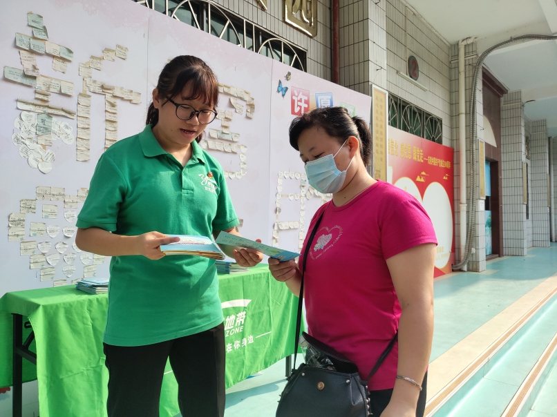 图:驻校社工向家长介绍家庭正向管教服务。