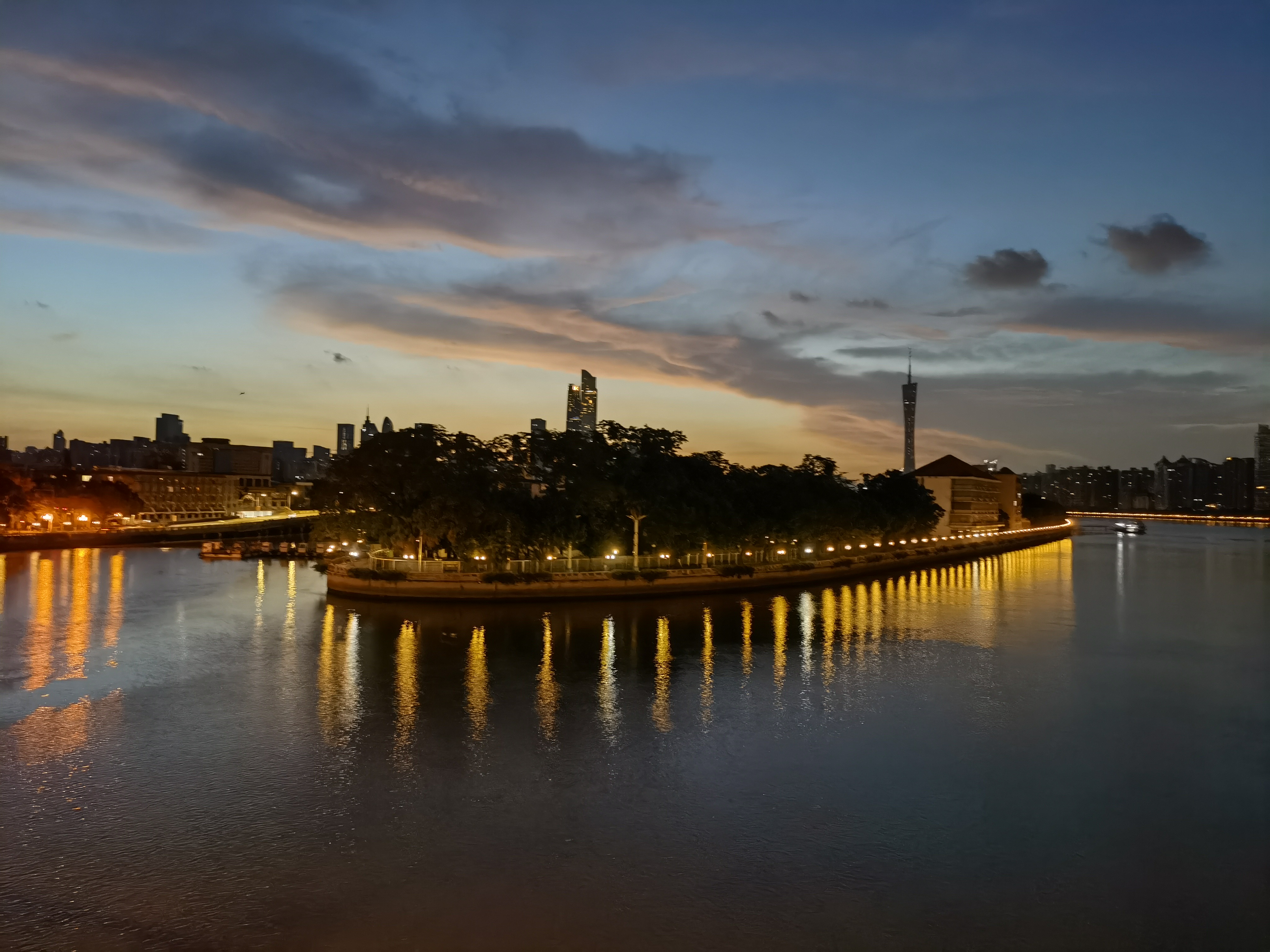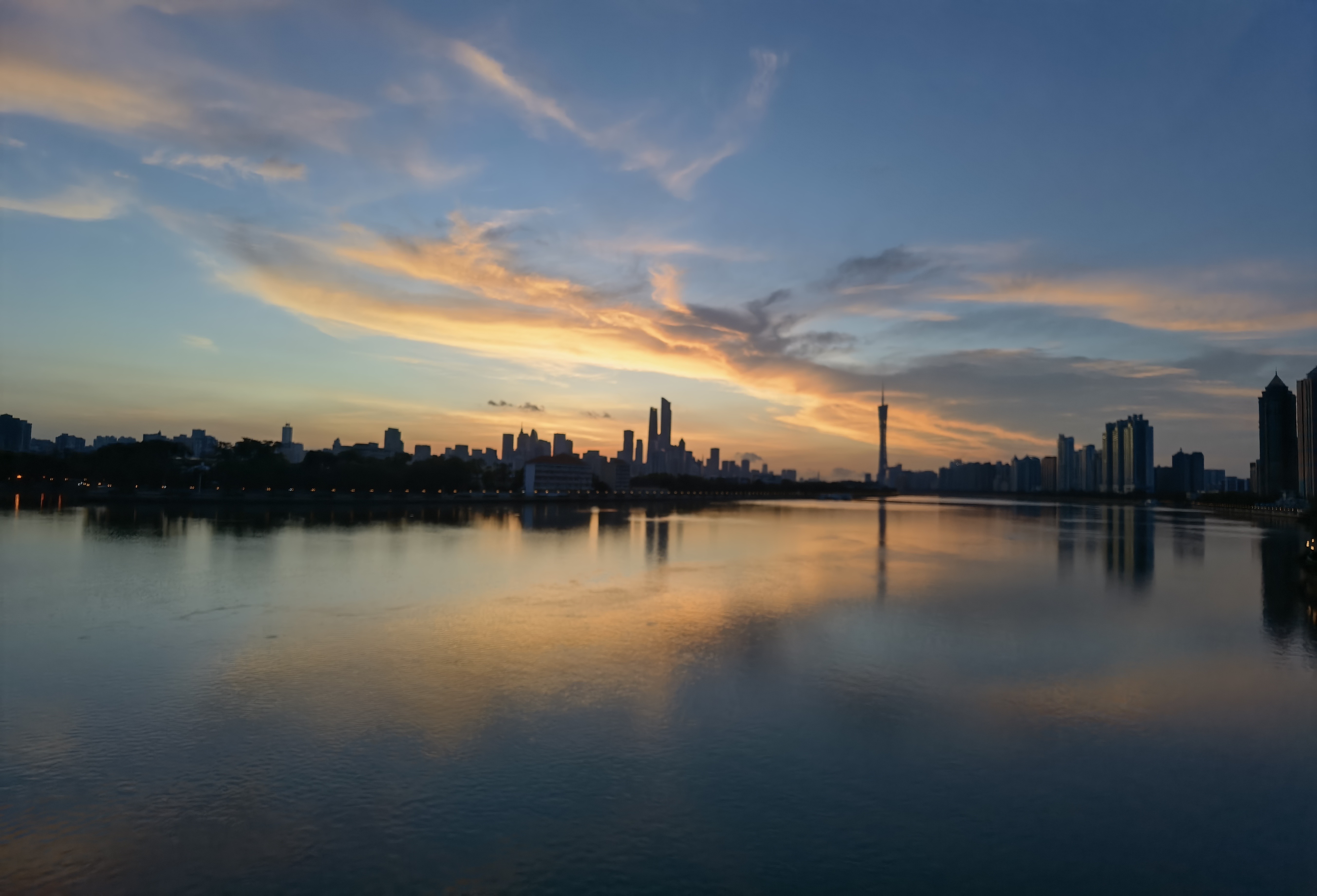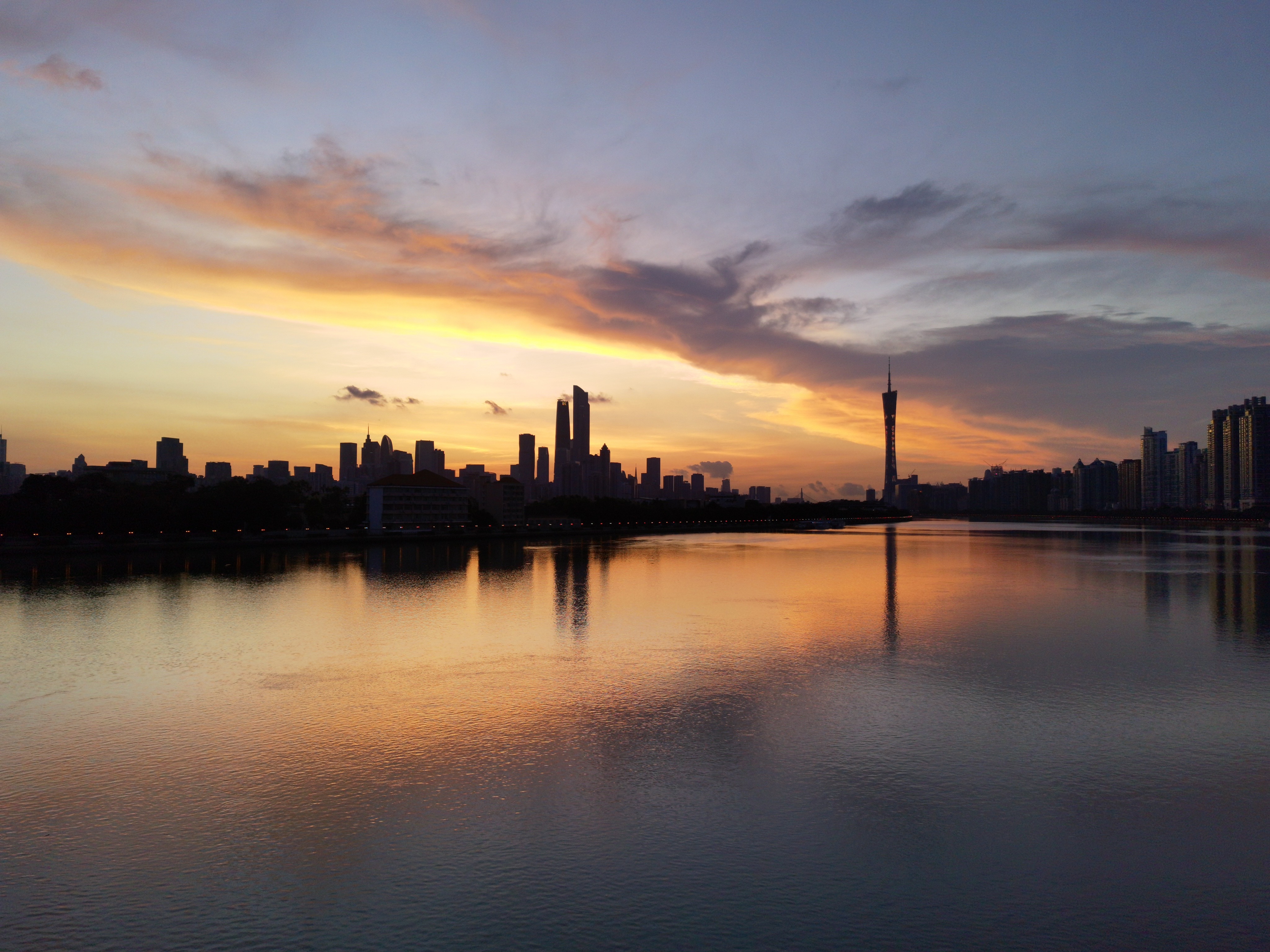 2022年7月15早晨5:10-6:10,随着太阳慢慢升起,天空的云朵被染成了金色,霞光映照在珠江水面,天空风起云涌,江面的颜色也变得丰富多彩起来。