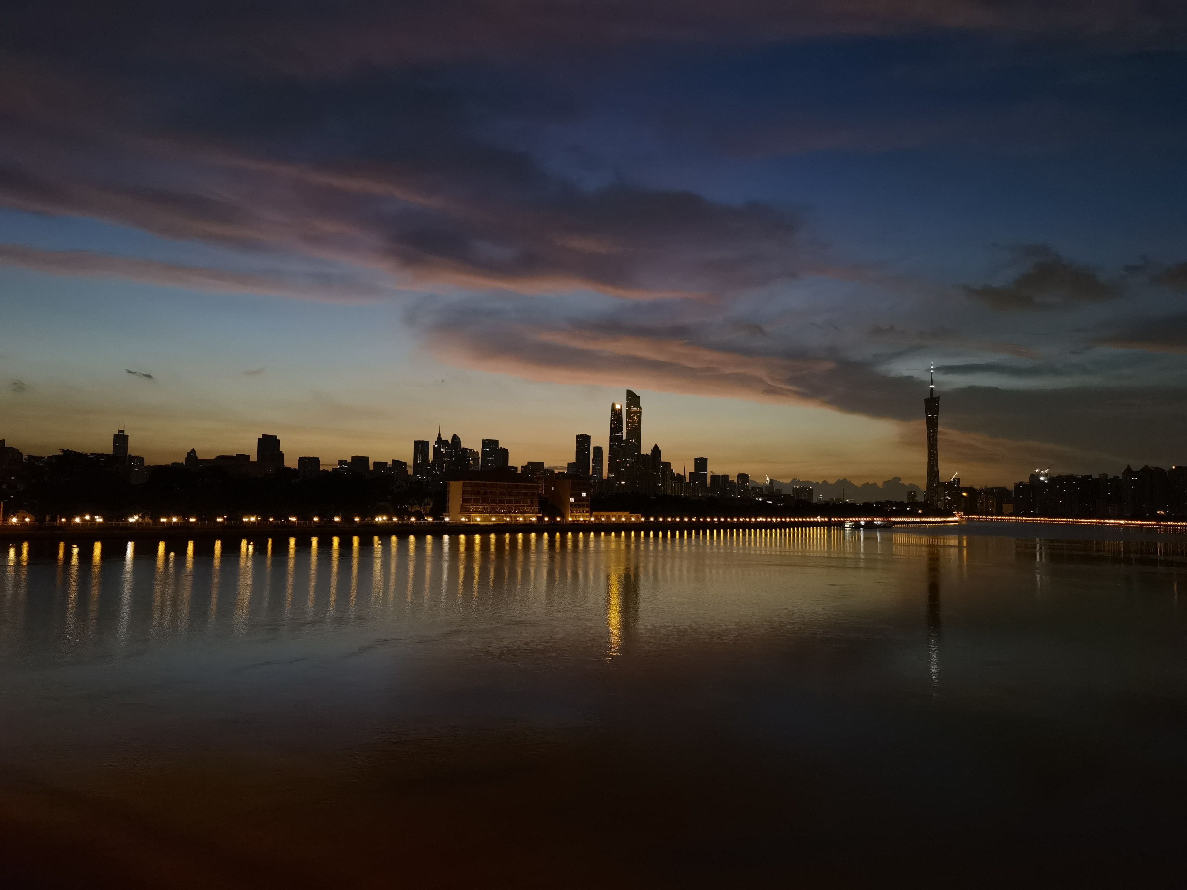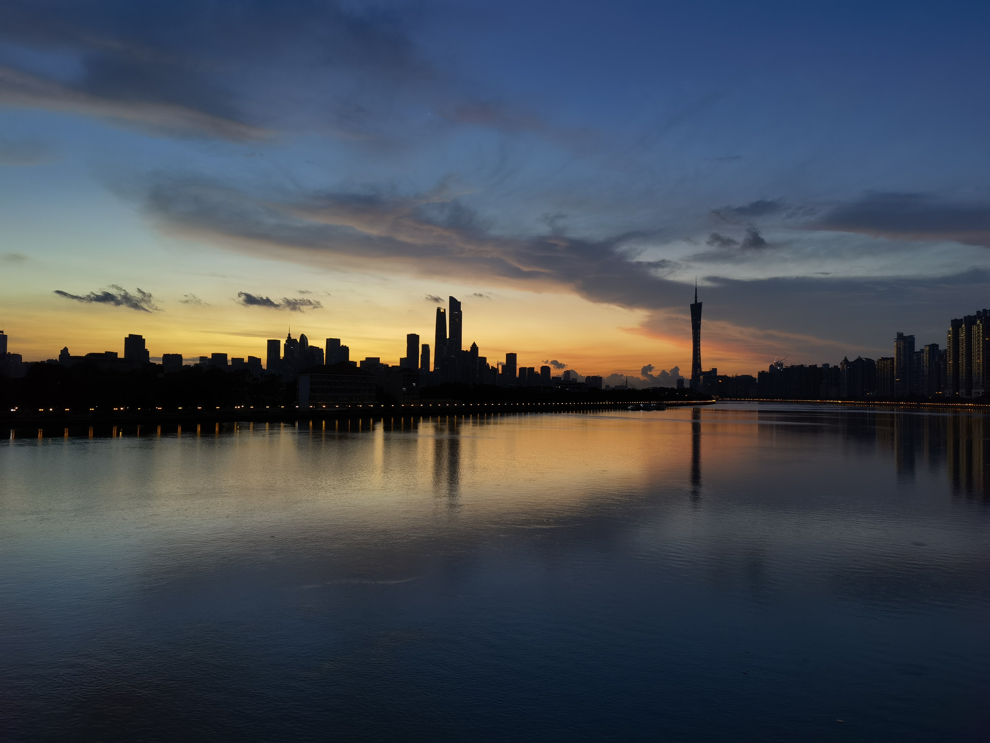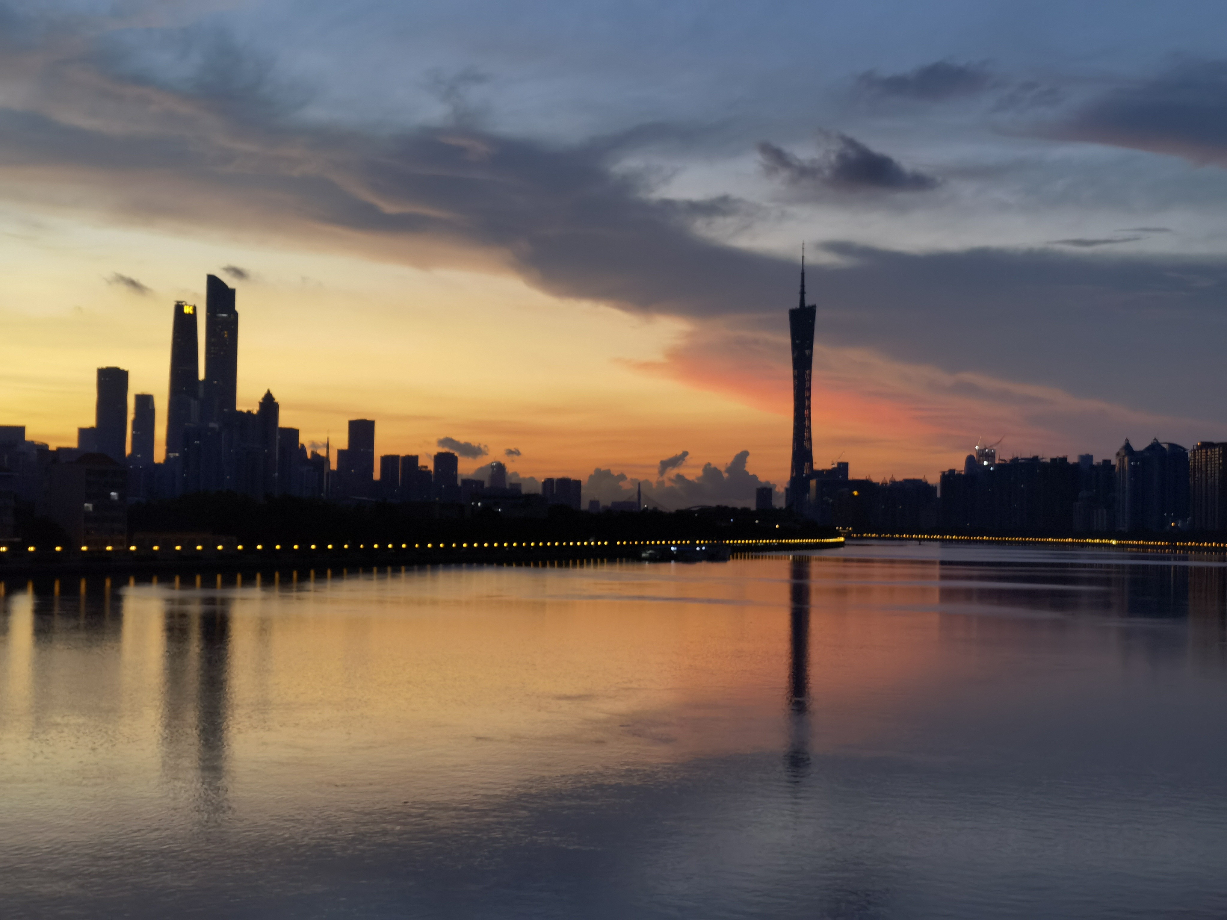 2022年7月15早晨5:10-6:10,随着太阳慢慢升起,天空的云朵被染成了金色,霞光映照在珠江水面,天空风起云涌,江面的颜色也变得丰富多彩起来。