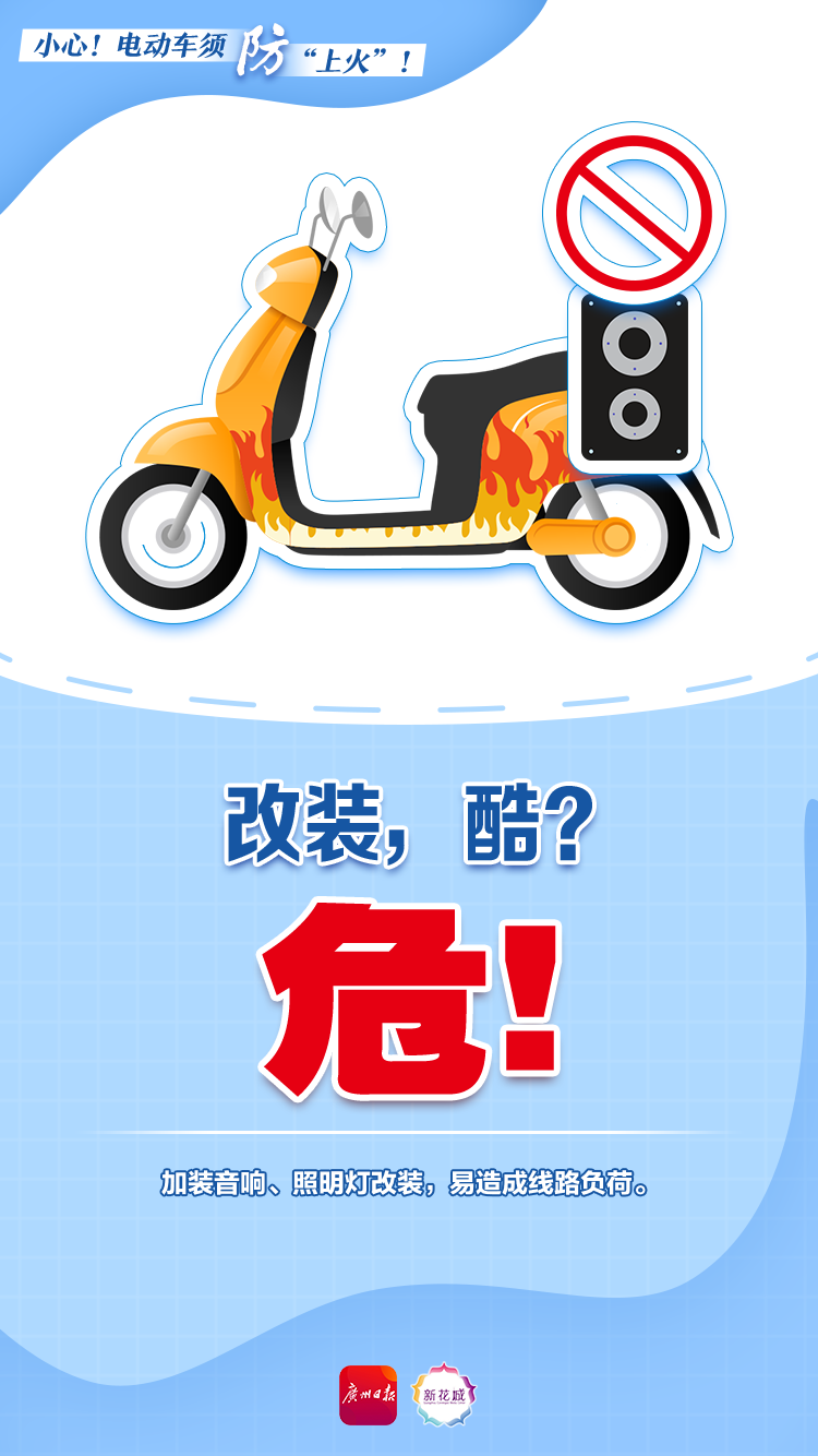 “非法改装车涉及电机、电池、电路改变,容易留下火灾隐患,造成车辆自燃;若改变车辆的底盘结构、增加车速、轮胎、悬架、刹车系统,将会影响车辆的制动、平衡,容易引发交通事故的发生。”广州交警提醒,为了自己和他人的安全,请广大车主切勿以身试法,非法改装车辆,更不要为了追求刺激而“飙车”。