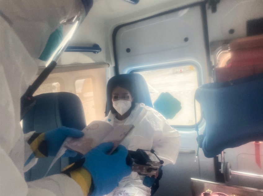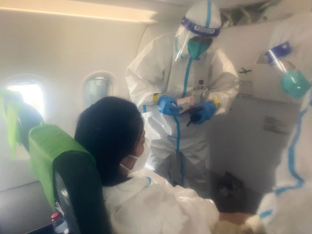 情况紧急,民警们迅速穿着防护装备,顶着高温赶往停机坪,在狭窄的救护车车厢内完成了旅客及其同行家人的全部验放工作。同时,白云边检站积极协调疫情防控专班,竭力开道将患病旅客送上救护车,为旅客送医救治赢得了宝贵时间。